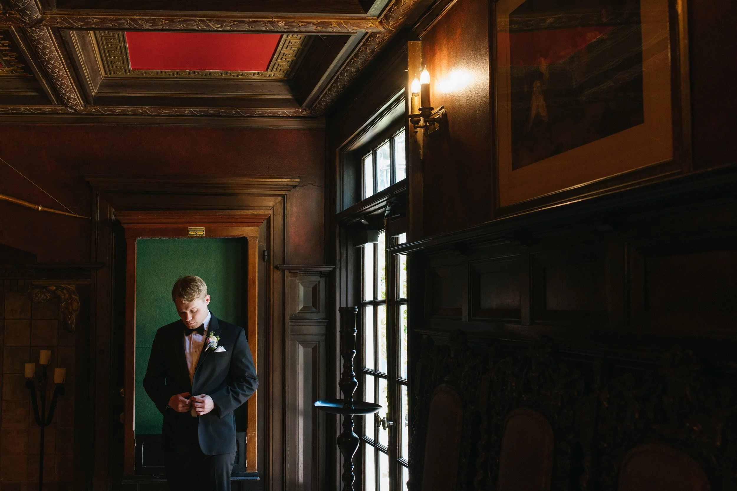 Following the ceremony, a buffet-styled dinner was held in the mansion's iconic Colonnade room, providing an intimate and elegant setting for the newlyweds and their guests. After we snuck away to take advantage of golden hour for photos on the river’s edge, the couple entered their reception downstairs in the courtyard, where the upbeat atmosphere was enhanced by music provided by Sound Wave Mobile DJ.